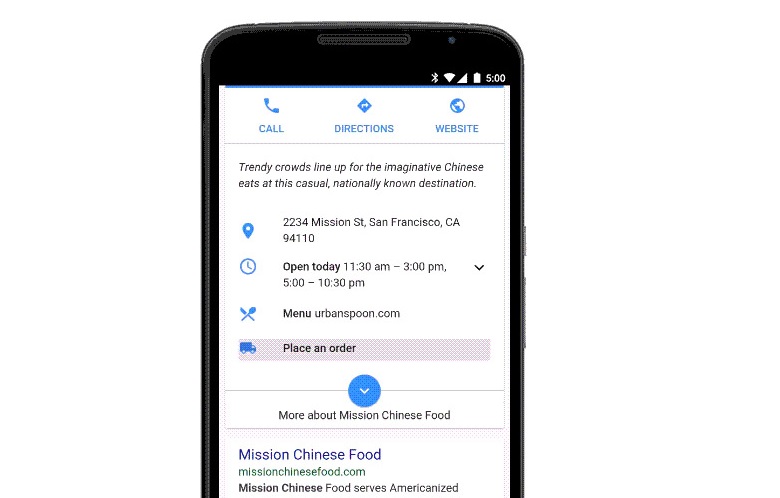 Em breve, nós brasileiros poderemos pedir comida online diretamente através do Google. Ao pesquisarmos o nome de um estabelecimento, o buscador nos fornece atualmente o endereço, telefone, site e horário de funcionamento do mesmo.